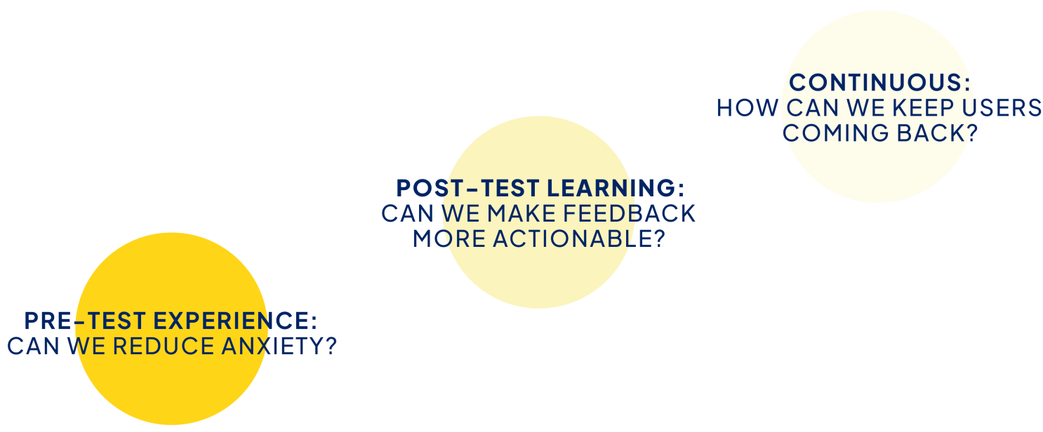 Pre-test – Can we help reduce user anxiety before the test? Maybe by creating practice exercises before the test. Post-test – Can we make feedback more actionable? Maybe by sending notifications on areas of improvement based on test results. Continuous Engagement – How can we keep users coming back for further learning? Small monthly challenges or newsletter emails with education content?